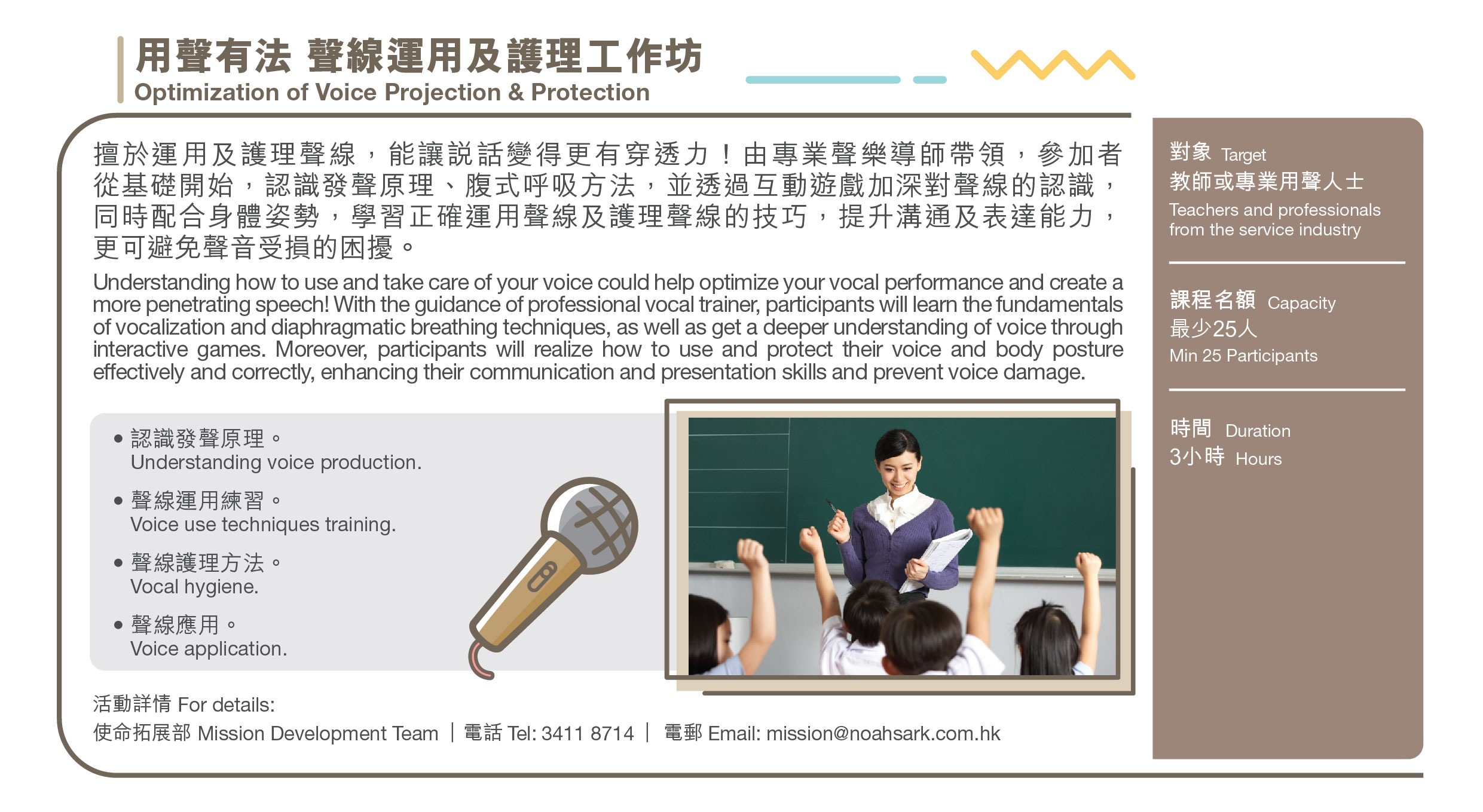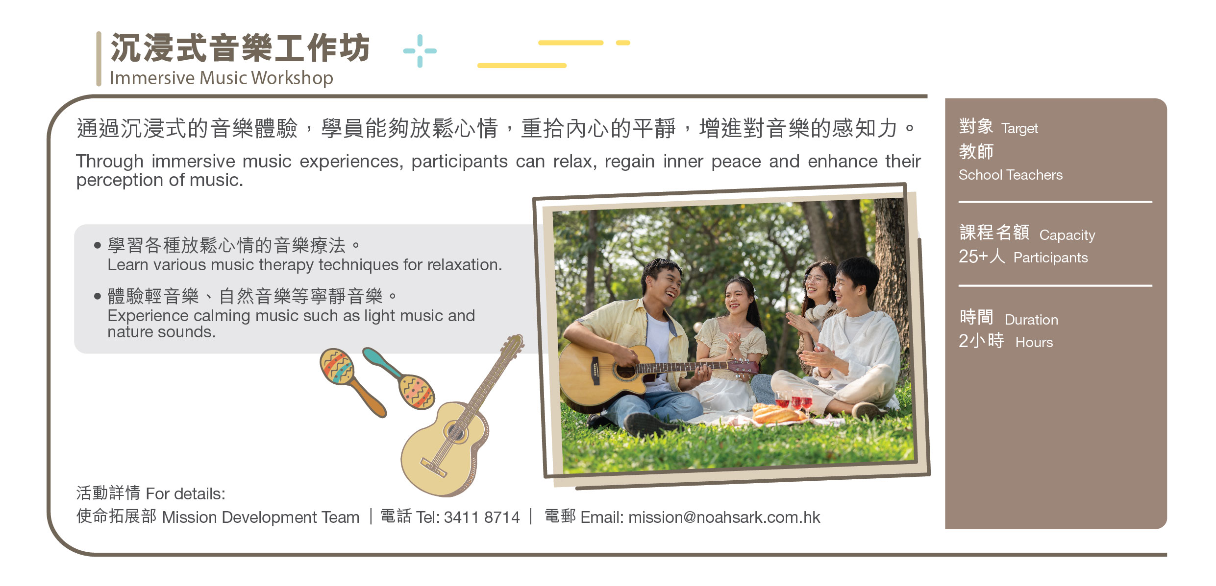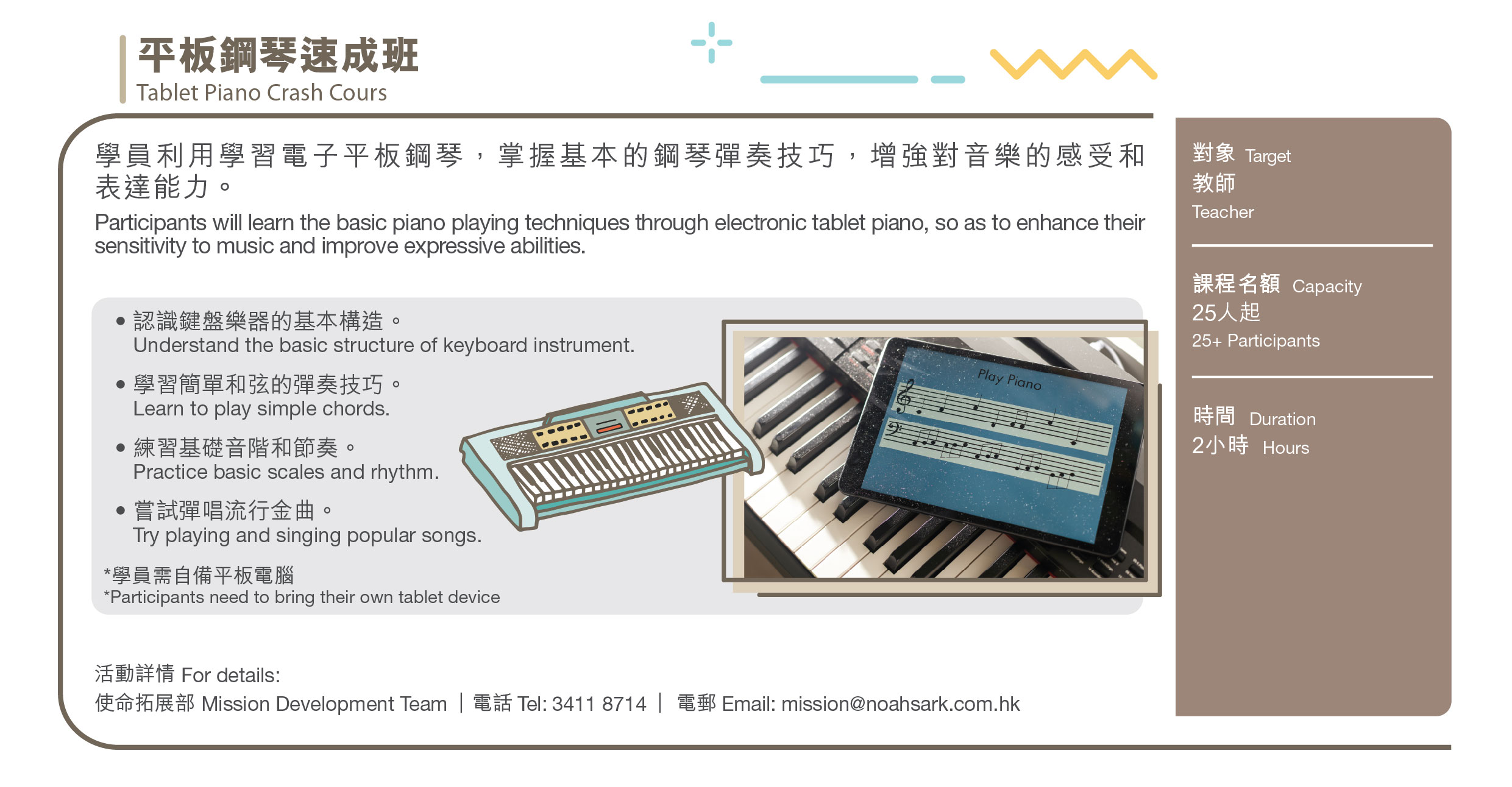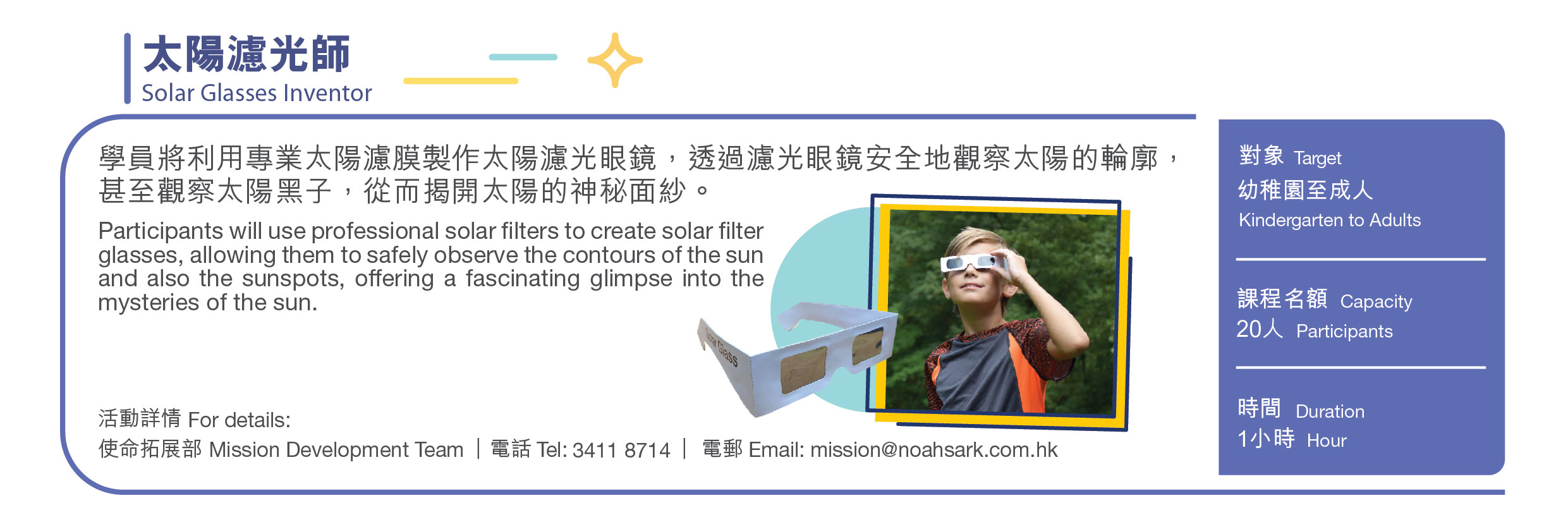 | 活動詳情 | 使命拓展部 電話: (852)3411 8714 電郵:mission@noahsark.com.hk |