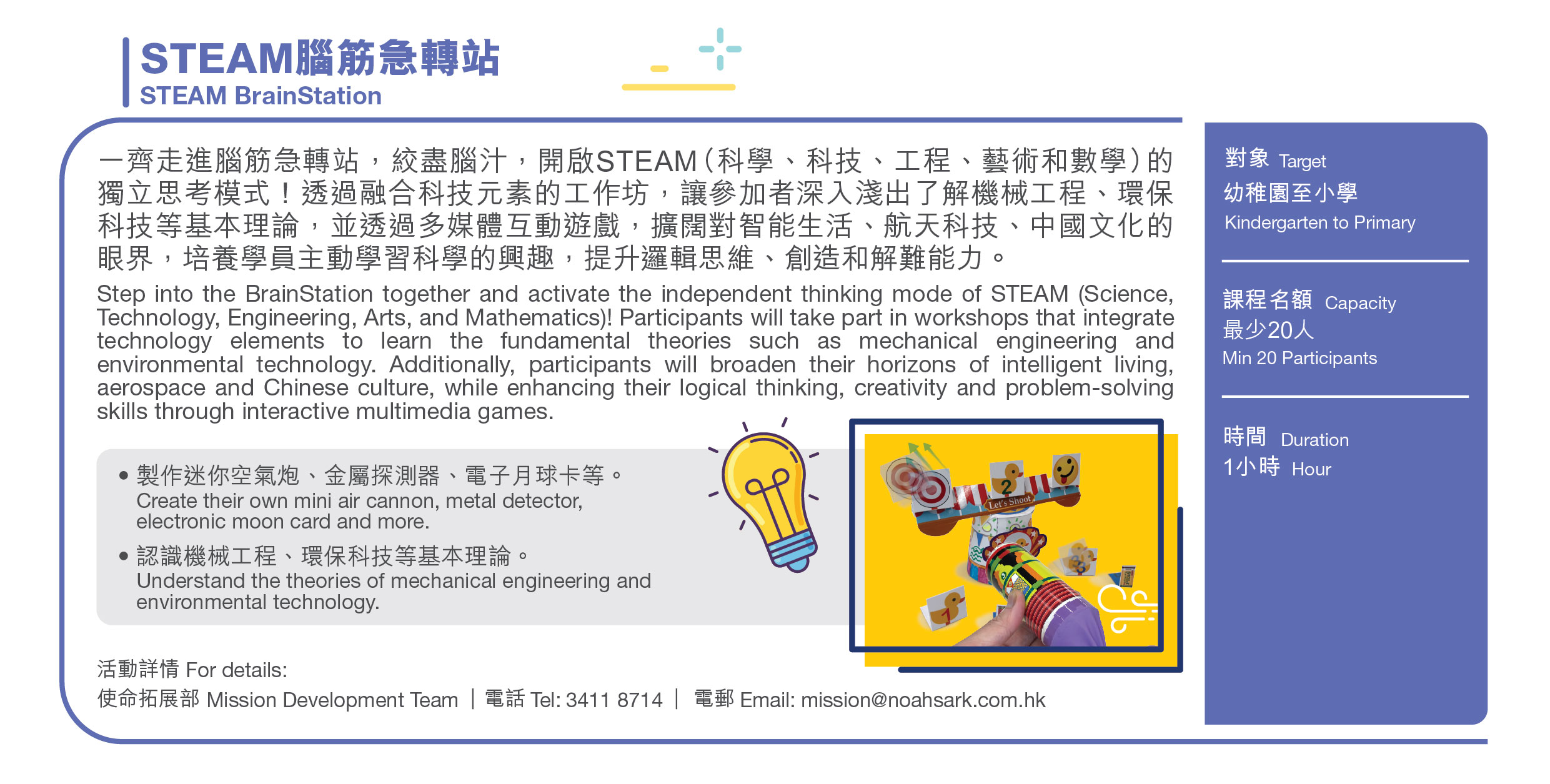 | 活動詳情 | 使命拓展部 電話: (852)3411 8714 電郵: mission@noahsark.com.hk |